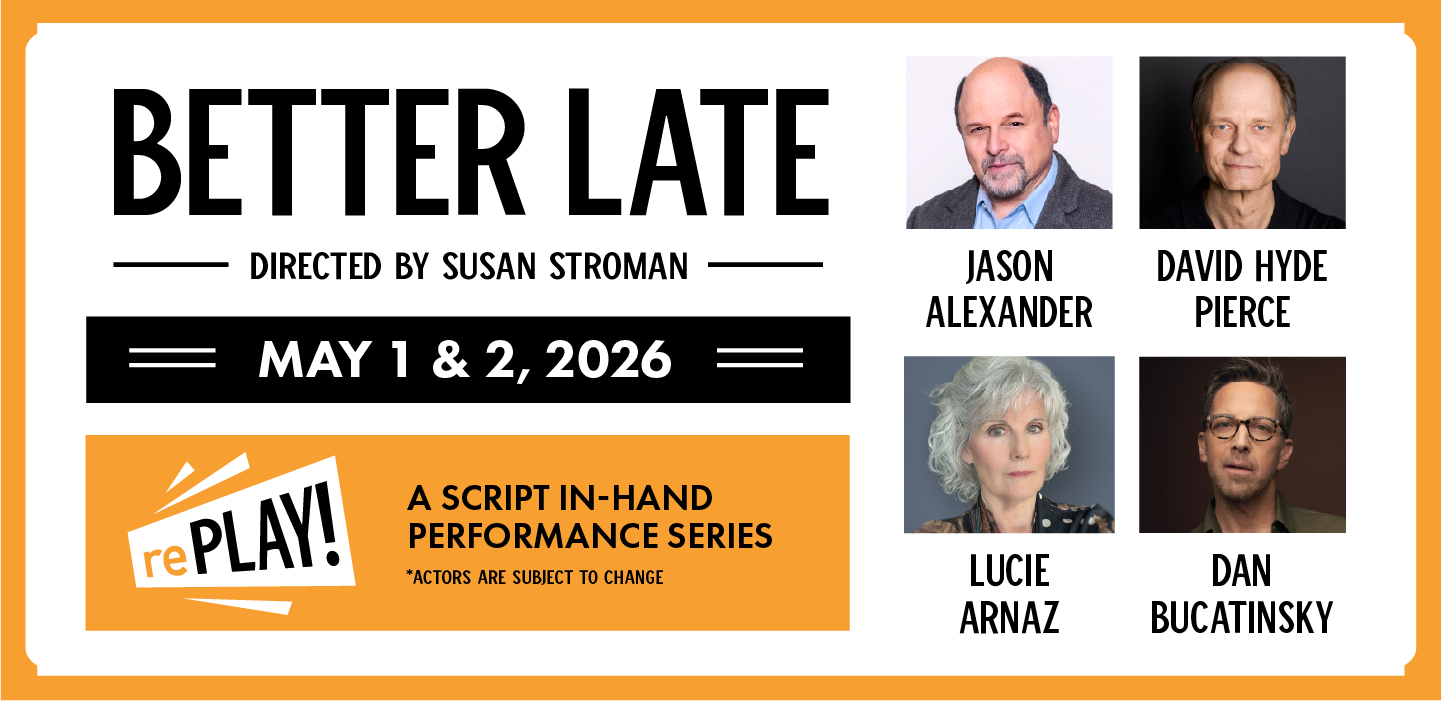 Better Late is a part of The Plaza’s script-in-hand rePLAY series. The next performance of rePLAY will be The Tale of the Allergist’s Wife, March 13 and 14. Directed by Philip Wm. McKinley, The Tale of the Allergist’s Wife stars Charles Busch, Chris Carranza, Harriet Harris, Alix Korey, and Lewis J. Stadlen.